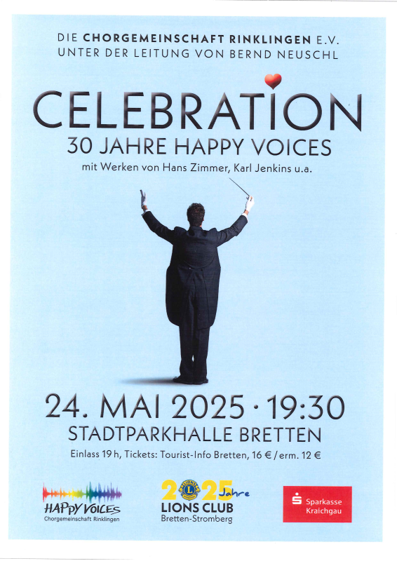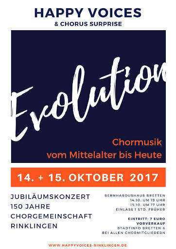 1250 Jahre Bretten, 500 Jahre Reformation und 150 Jahre Sängerbund Rinklingen sind Anlass genug für die Happy Voices, an zwei Konzertabenden unter dem Motto „Evolution“ ein außergewöhnliches Programm darzubieten.