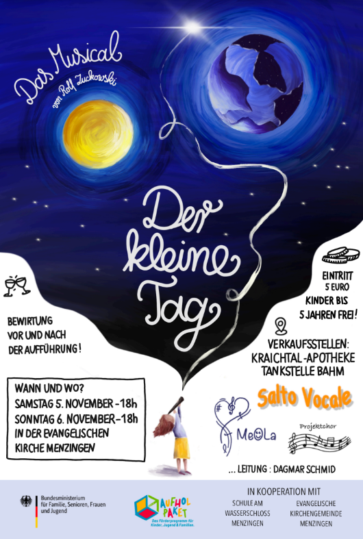 Schule am Wasserschloss / Grundschule Menzingen das Musical "Der kleine Tag" auf. Das Musical, das nicht nur für Kinder ist, zeigt uns, dass die Kleinen oft größer sind, als die Großen denken. So wie es jeden Tag nur einmal geben kann, ist auch der kleine Tag einmalig, und das erleben wir mit ihm auf seiner Reise auf dem Lichtstrahl zur Erde und zurück. An beiden Tagen können sich jeweils 150 Besucher und Besucherinnen von den Mitwirkenden verzaubern lassen. Karten können Sie bei unseren Verkaufsstellen in Menzingen, der Tankstelle Bahm und der Kraichtal Apotheke Bratzler, erwerben. Sollten Sie keine