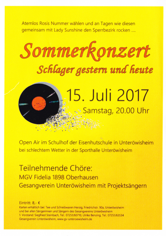 Dies alles ist möglich beim diesjährigen Open Air "Sommerkonzert - Schlager gestern und heute", des GV Unteröwisheim am 15. Juli im Schulhof der Eisenhutschule Unteröwisheim.