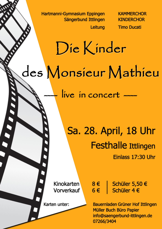 Der Kinderchor des Sängerbundes  Ittlingen und der Kammerchor des Hartmanni-Gymnasium Eppingen unter der Leitung von Timo Ducati stellt sich der Herausforderung, diese anspruchsvollen Lieder im Original mit Klavierbegleitung und Solisten parallel zum Filmgeschehen aufzuführen.